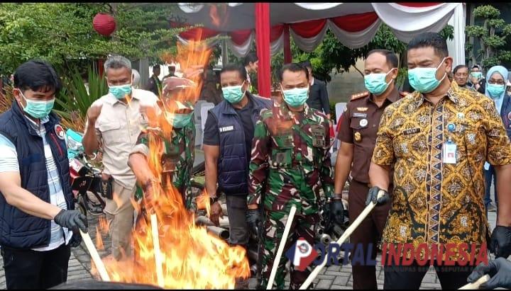Proses pemusnahan dilakukan dengan metode berbeda untuk setiap barang bukti. Narkoba dibakar, miras dilindas alat berat, dan knalpot brong dihancurkan dengan mesin pemotong, disaksikan oleh Forkopimda Sidoarjo.