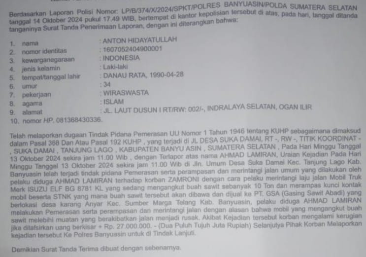 Korban, Zamroni, yang mengalami kerugian sekitar Rp 27 juta akibat perbuatan tersebut, langsung melaporkan kejadian itu ke Polres Banyuasin. Dugaan pelanggaran ini mengacu pada Pasal 368 dan 192 KUHP tentang pemerasan dan perampasan.