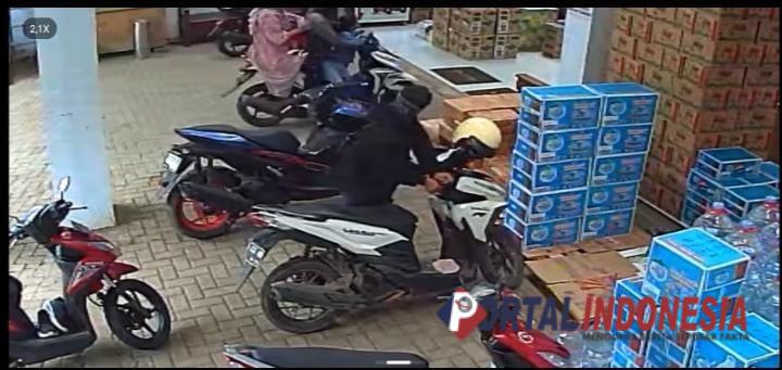 Dua pelaku datang dari arah selatan menggunakan motor matik biru. Mereka berhenti di samping toko, mengawasi keadaan, lalu mulai merusak kunci sepeda motor Beat merah dan Vario putih yang terparkir di lokasi.