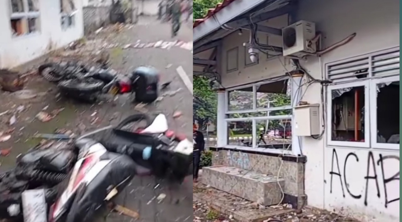 Bagian lobi gedung dibakar, mobil dalmas yang terparkir di sebelah kiri gedung hangus terbakar, serta sejumlah motor yang berada di halaman depan ikut dilalap api.