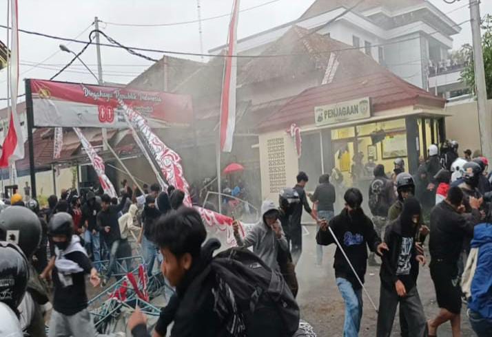 Semakin sore aksi semakin panas. Massa berusaha merangsek masuk ke markas polisi namun dihadang petugas. Terjadi aksi lempar dan semprotan gas air mata.