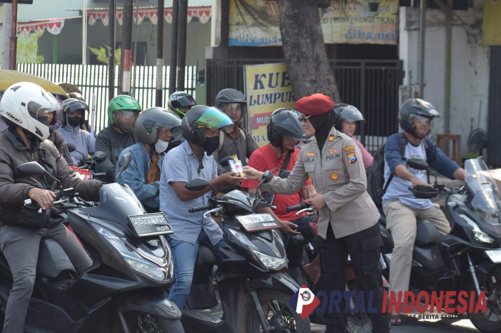 Dengan humanis Polwan dari Polresta Sidoarjo membantu kelancaran lalu lintas serta menyapa masyarakat, yakni dengan membagikan bingkisan berlabelkan stiker Hari Jadi Polwan ke-76.