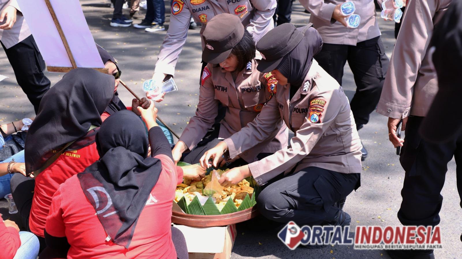 Personel Polresta Malang Kota tampak membagikan kue dan air mineral kepada para demonstran.
