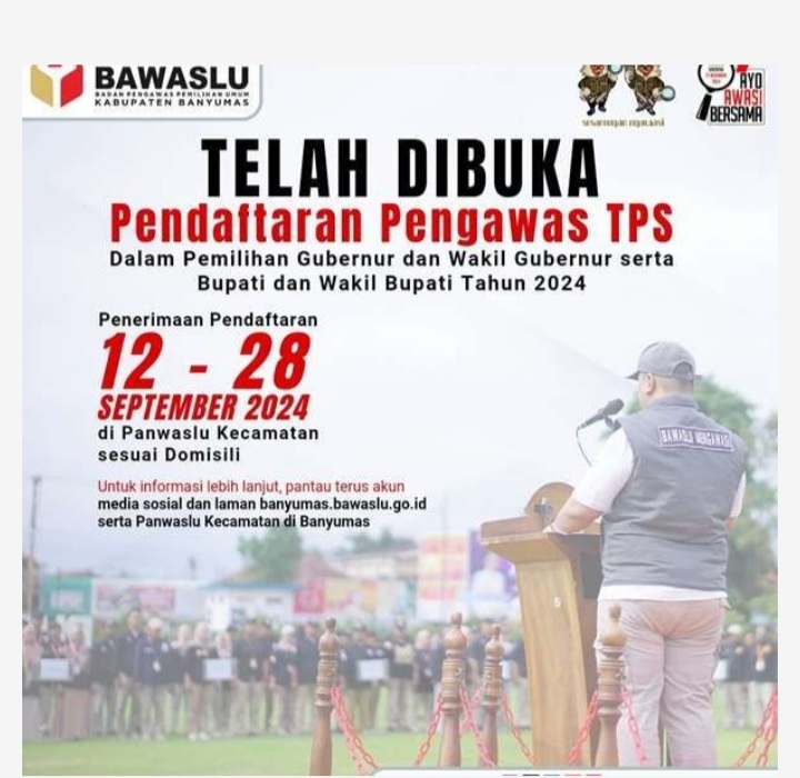 PURWOKERTO – Badan Pengawas Pemilihan Umum (Bawaslu) Kabupaten Banyumas membuka pendaftaran Pengawas TPS sejak tanggal 12 September sampai dengan 28 September 2024.