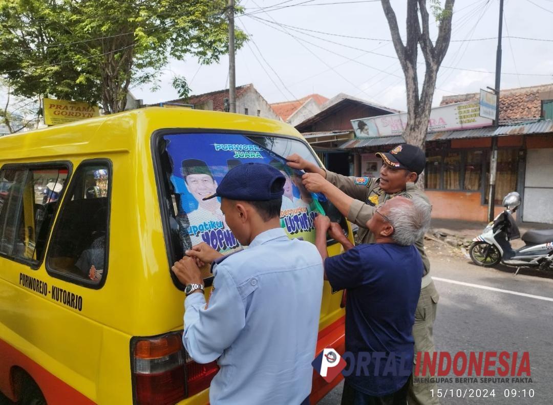 PURWOREJO- Tim gabungan yang terdiri dari Bawaslu Purworejo, Satpol PP, Dinas Perhubungan dan Polres Purworejo menertibkan ratusan stiker branding angkutan umum. Penertiban dilakukan di tiga titik yakni di jalur Pasar Kongsi Purworejo, sekitar Pasar Kutoarjo dan sekitar Terminal Purwodadi.