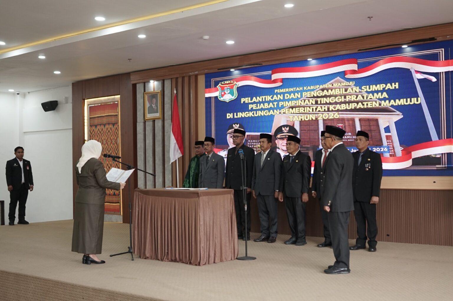 MAMUJU – Bupati Mamuju, Hj. Sitti Sutinah Suhardi, secara resmi melantik sekaligus mengambil sumpah jabatan enam pejabat pimpinan tinggi pratama atau eselon II di lingkungan Pemerintah Kabupaten Mamuju, Jumat (30/1/2026), bertempat di Ruang Pola Kantor Bupati.
