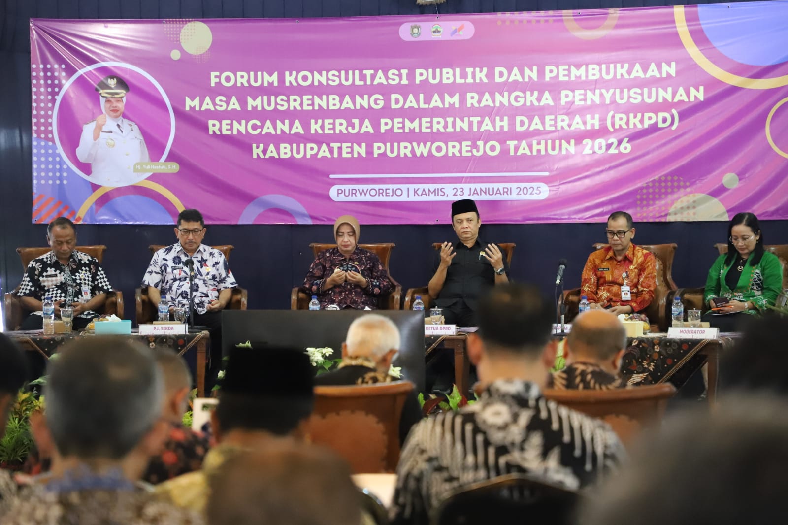 PURWOREJO – Bupati Purworejo Hj Yuli Hastuti SH didampingi Pj Sekda Kabupaten Purworejo Drs R Achmad Kurniawan Kadir MPA hadir dan membuka Forum Konsultasi Publik dan Pembukaan Masa Musrenbang 2025 dalam rangka penyusunan RKPD Kabupaten Purworejo tahun 2026 di Pendopo Agung Purworejo, Kamis (23/01/2025).