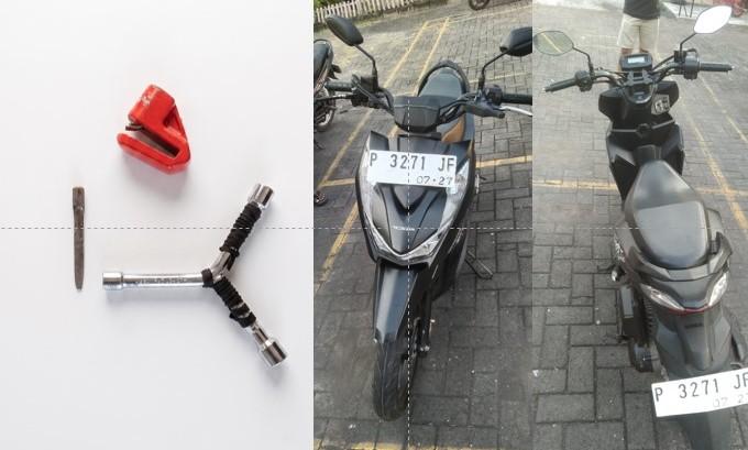 Di antaranya satu set kunci T yang biasa dipakai untuk merusak kontak kendaraan, sebuah jaket hitam, serta dua lembar sarung berwarna gelap yang ditinggalkan pelaku saat kabur.