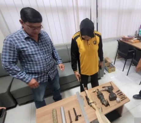 Saat penggeledahan, polisi menyita satu pucuk senjata api laras panjang rakitan berkaliber 5,56 mm, beberapa peralatan bubut, dan sejumlah batang aluminium yang diduga sebagai bahan baku pembuatan senjata.