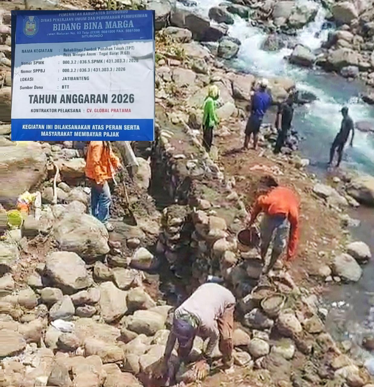 SITUBONDO – Pelaksanaan proyek Rehabilitasi Tembok Penahan Tanah (TPT) di ruas jalan Wringin Anom–Tegal Barat (R.68), Kecamatan Jatibanteng, menuai perhatian publik. Kegiatan yang dibiayai melalui dana Bantuan Belanja Tidak Terduga (BTT) dan dikelola oleh Dinas Pekerjaan Umum dan Perumahan Pemukiman (PUPP) Bidang Binamarga Kabupaten Situbondo itu diduga tidak berjalan sesuai petunjuk teknis.