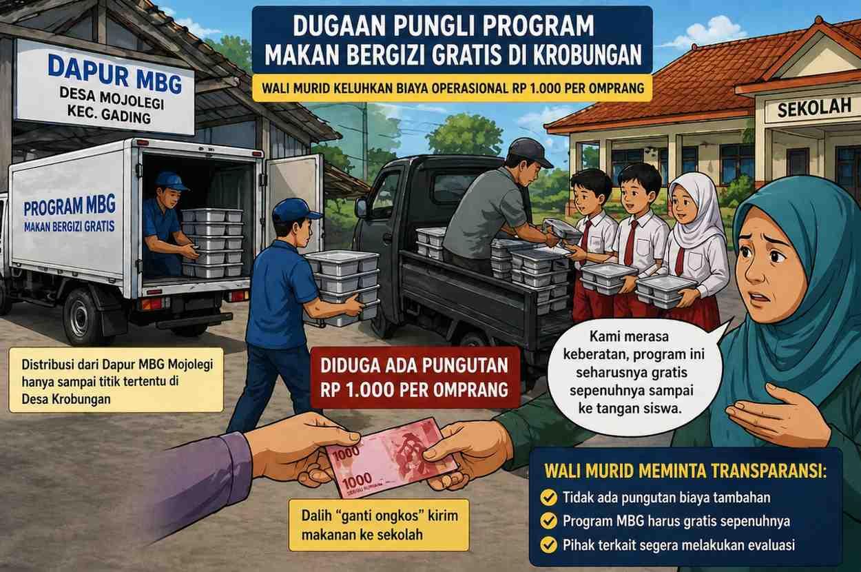 PROBOLINGGO – Program Makan Bergizi Gratis (MBG) yang seharusnya menjadi bantuan bagi masyarakat kini menjadi sorotan di Kabupaten Probolinggo. Sejumlah wali murid di Desa Krobungan, Kecamatan Krucil, mengeluhkan adanya dugaan pungutan biaya tambahan sebesar Rp1.000 per porsi atau ompreng, Jumat (24/4/2026).