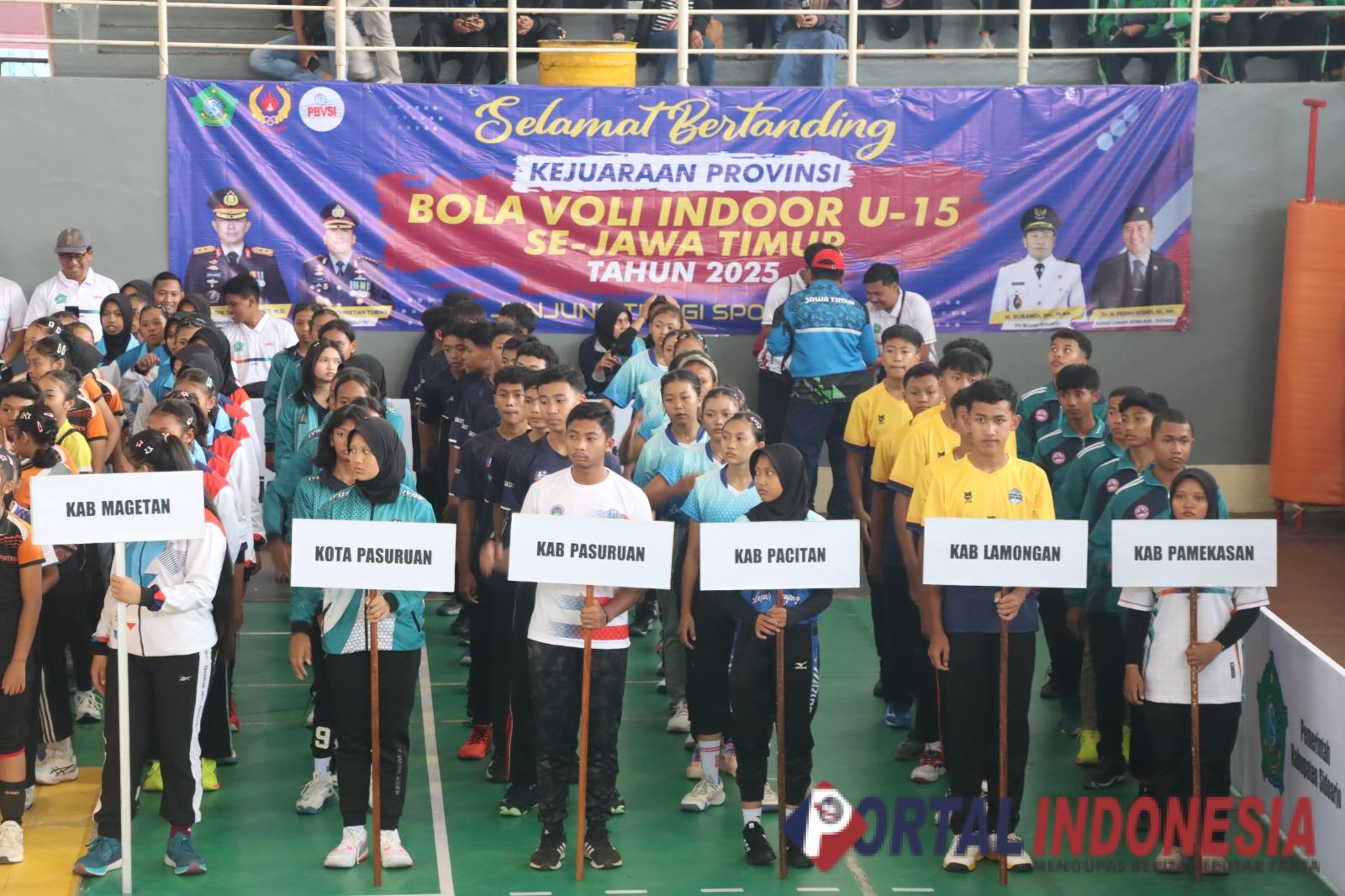SIDOARJO — Kejuaraan Provinsi (Kejurprov) Bola Voli U-15 antar klub se-Jawa Timur resmi dibuka oleh Forkopimda Sidoarjo bersama Ketua Harian PBVSI Jatim Kombes. Pol. Dirmanto dan Kapolresta Sidoarjo Kombes. Pol. Christian Tobing di GOR Sidoarjo, Sabtu (11/1/2025).