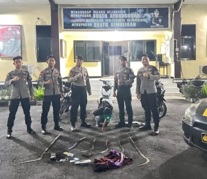 Petugas polisi berhasil mengamankan 1 orang pemuda dengan kaos hitam bertuliskan STM Dayak, 3 unit sepeda motor matic, 6 buah senjata tajam yang rencana digunakan untuk tawuran.