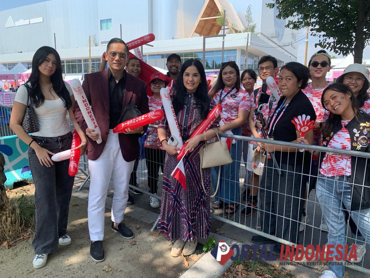 Menteri AHY dan Annisa terlihat fokus dan antusias dengan sesekali meneriakan “Ayo Indonesia” dan menepukkan balon merah putih bertuliskan Indonesia.