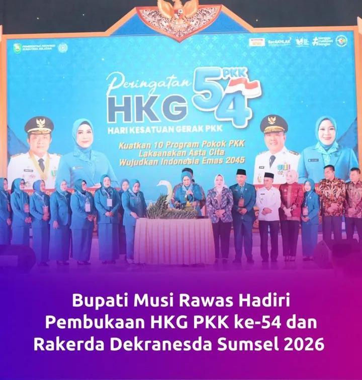MUSI RAWAS  — Bupati Musi Rawas, Ratna Machmud, bersama Ketua Tim Penggerak (TP) PKK Kabupaten Musi Rawas, Riza Novianto Gustam, menghadiri pembukaan Peringatan Hari Kesatuan Gerak (HKG) PKK ke-54 yang dirangkaikan dengan Rapat Konsultasi (Rakon) PKK serta Rapat Kerja Daerah (Rakerda) Dekranasda Provinsi Sumatera Selatan Tahun 2026.