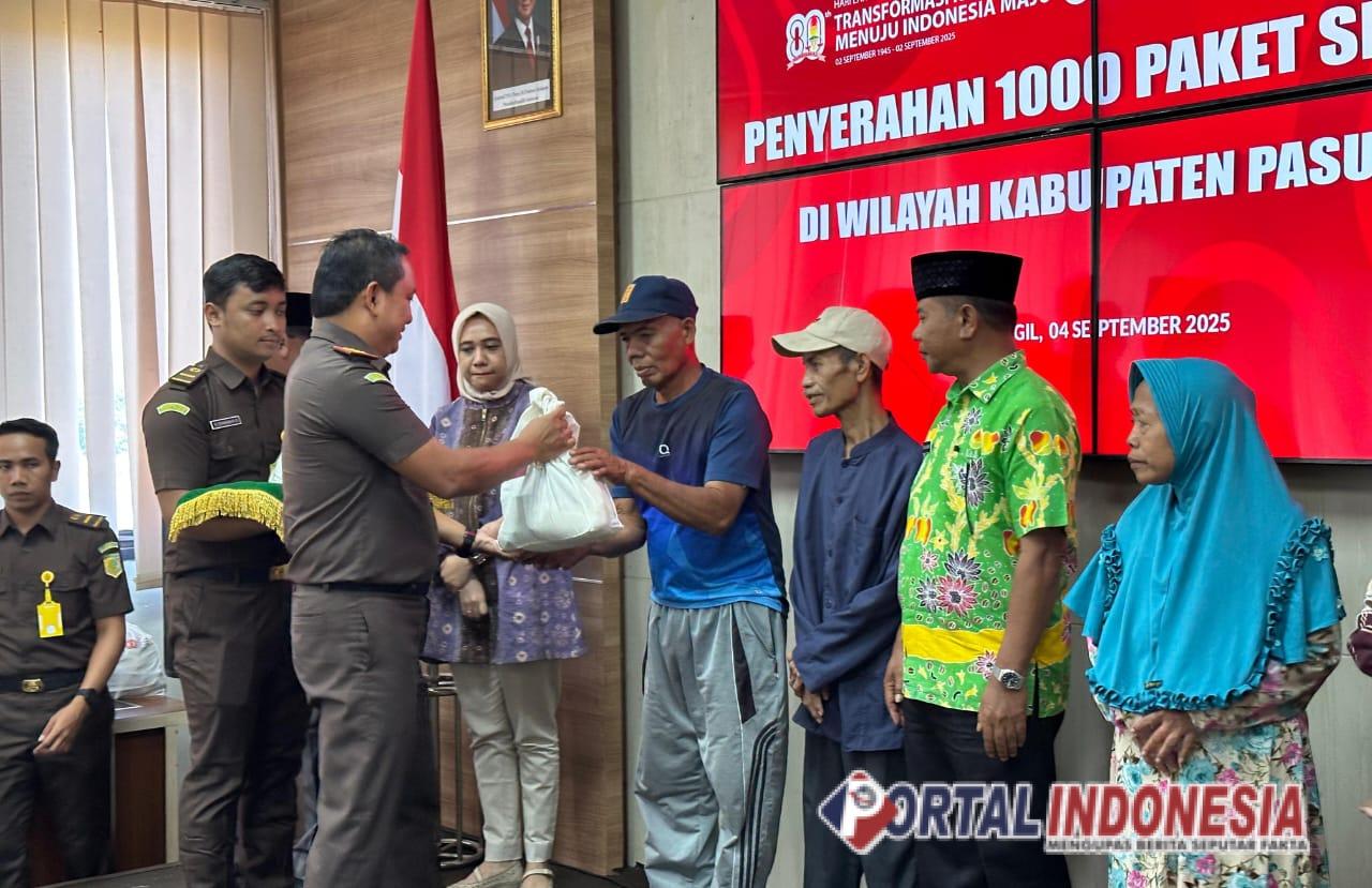 PASURUAN – Dalam rangka memperingati Hari Lahir (Harlah) Kejaksaan Republik Indonesia ke-80 tahun 2025, Kejaksaan Negeri Kabupaten Pasuruan menggelar kegiatan bakti sosial dengan menyalurkan 1.000 paket sembako kepada masyarakat. Kegiatan berlangsung di Kantor Kejari Pasuruan, Kamis (4/9) pagi.