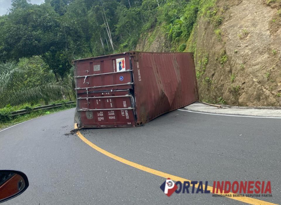 “Saat mencoba mendaki, pengemudi terlambat mengoper persneling. Kendaraan sempat mundur, lalu saat digas lagi, muatan di belakang kontainer bergeser dan menyebabkan kontainer terjatuh,” ujarnya.