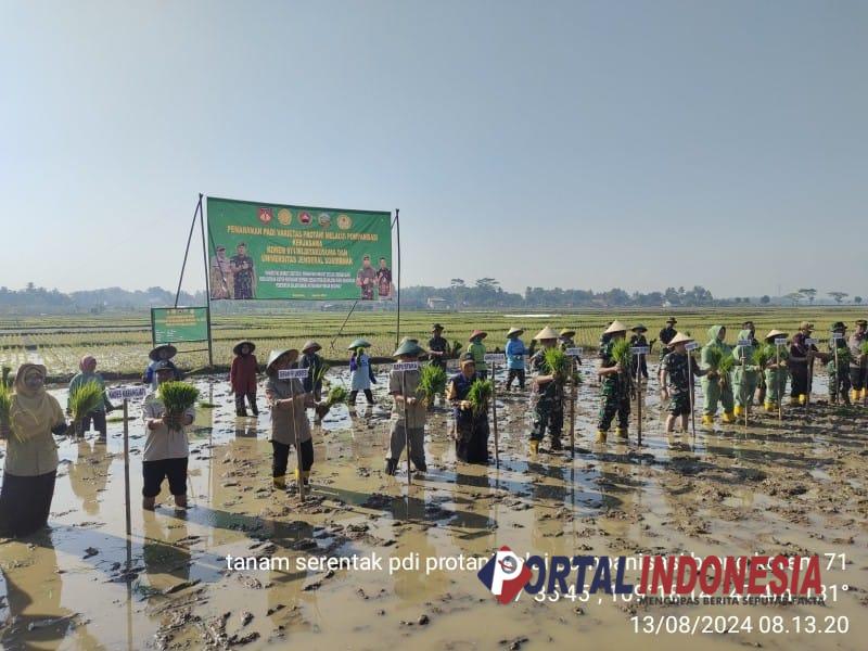 BANYUMAS — Komando Resor Militer (Korem) 071/Wijayakusuma bersama Fakultas Pertanian Universitas Jenderal Soedirman (Unsoed) Purwokerto serta Dinas Pertanian dan Ketahanan Pangan Kabupaten Banyumas, Jawa Tengah, menanam padi berprotein tinggi sebagai kontribusi dalam upaya meningkatkan ketahanan pangan dan kesejahteraan masyarakat di Desa Karangjati, Kecamatan Kemranjen, Kabupaten Banyumas, Selasa (13/8/2024).