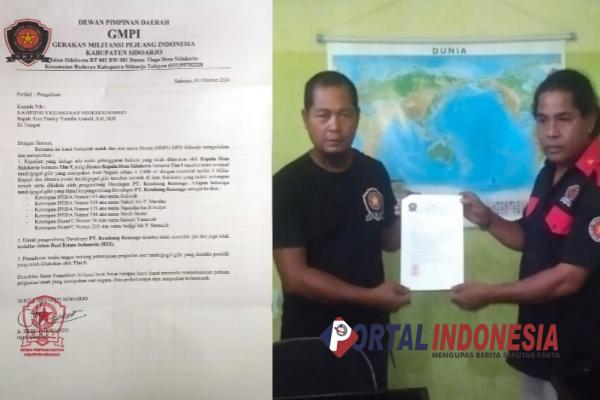SIDOARJO — Gerakan Militansi Pejuang Indonesia (GMPI) resmi melaporkan Kepala Desa (Kades) Sidokerto dan Tim 9 ke Kejaksaan Negeri (Kejari) Sidoarjo, terkait dugaan penyalahgunaan jabatan dalam transaksi jual beli tanah Gogol gilir seluas 5000 meter persegi.