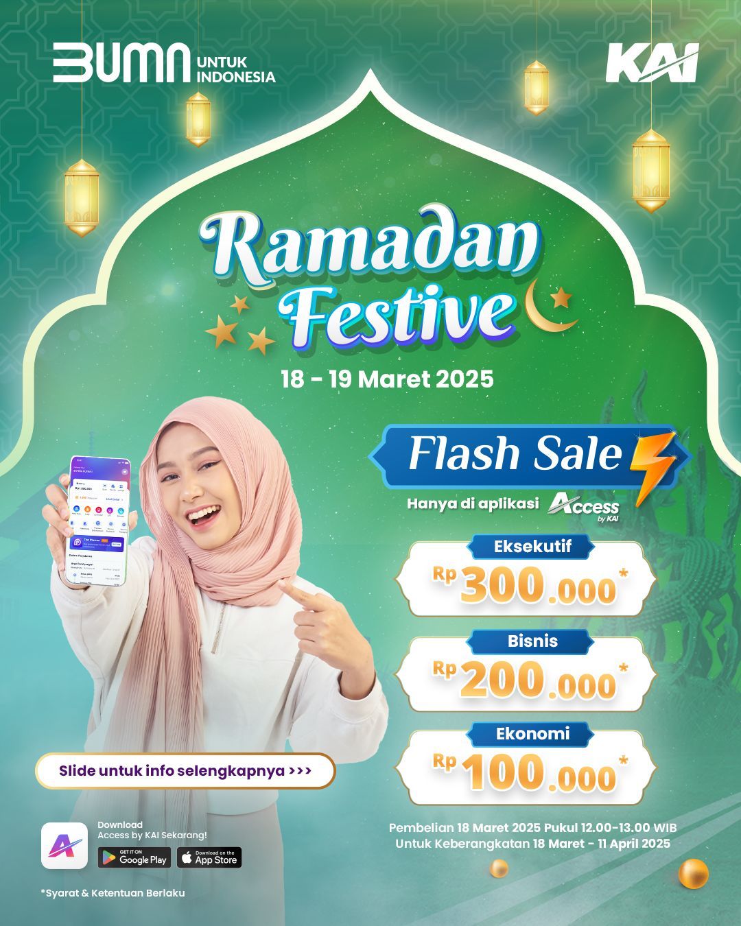 Pemesanan tiket untuk program Ramadan Festive dapat dilakukan melalui berbagai channel resmi KAI, seperti aplikasi Access by KAI, situs resmi kai.id, serta berbagai mitra resmi lainnya. “Pelanggan yang ingin mendapatkan harga Flash Sale wajib melakukan pemesanan melalui aplikasi Access by KAI pada waktu yang telah ditentukan,” ujar Feni.