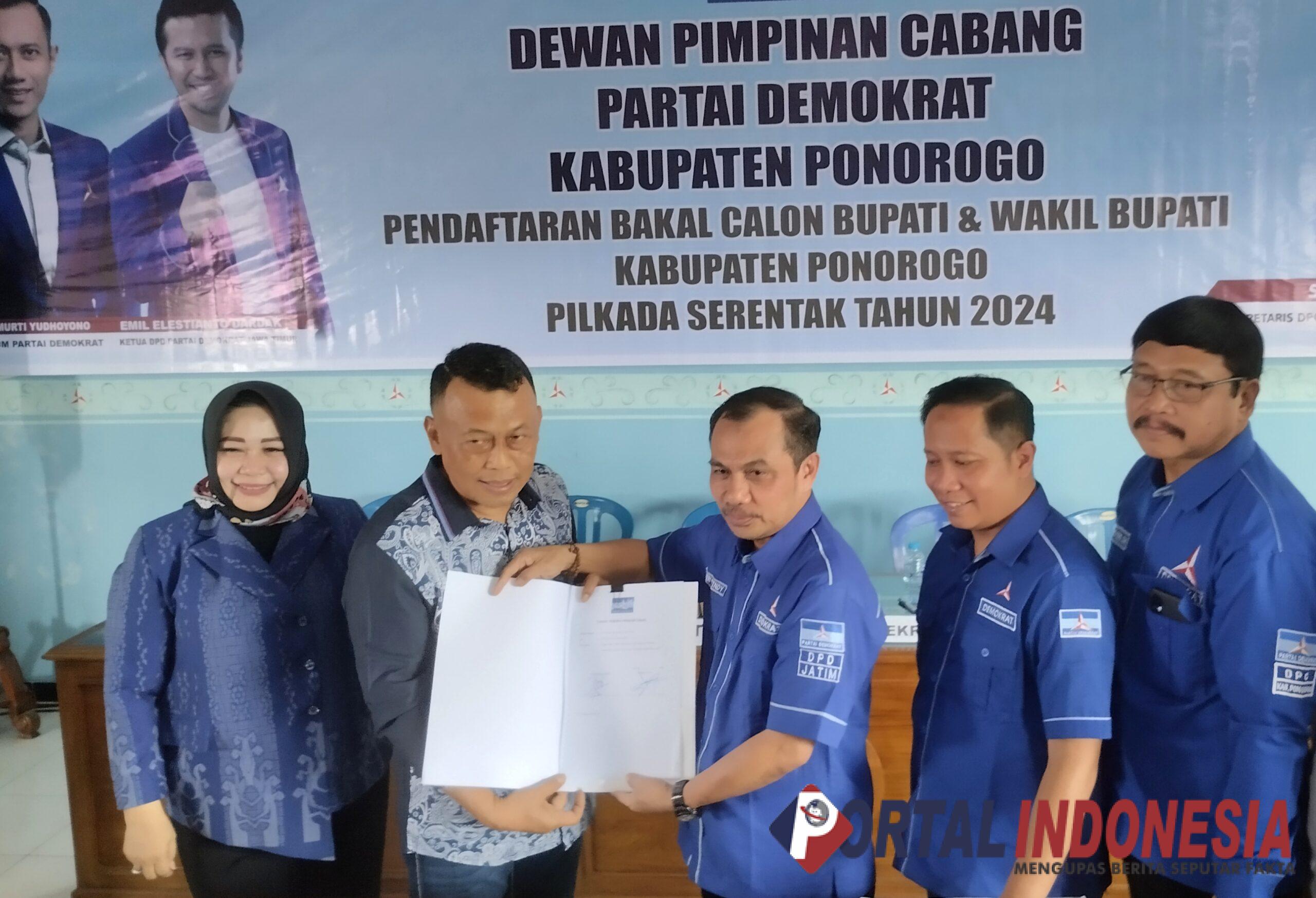 Bacalon pertahana tersebut mendatangi kantor DPC partai Demokrat Ponorogo, dengan didukung dan didampingi sejumlah tokoh-tokoh partai politik (parpol). Antara lain, PDI Perjuangan, PPP, PAN, PKB hingga Golkar.