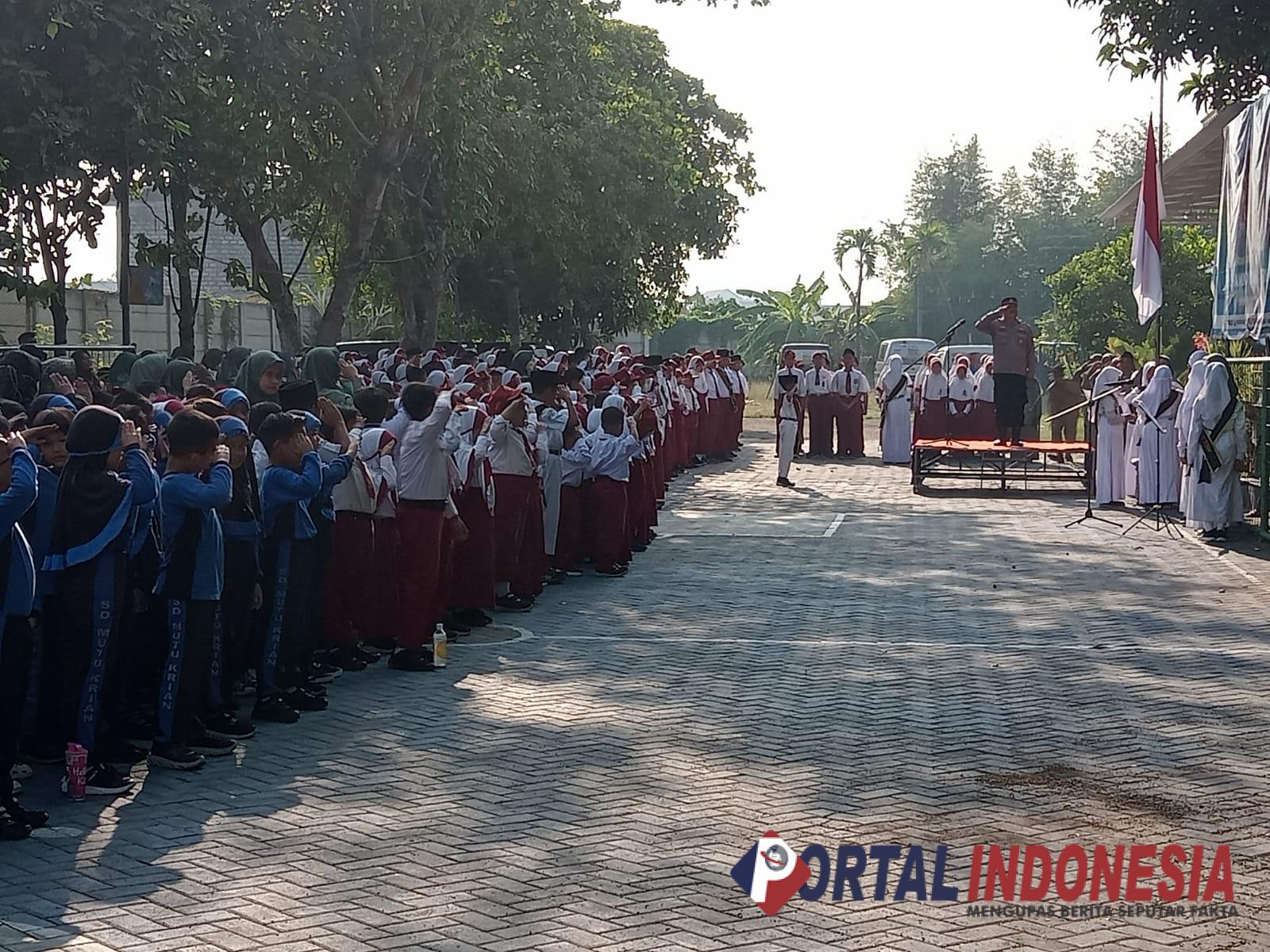 SIDOARJO — Polsek Krian, Polresta Sidoarjo, memberikan edukasi tentang bullying dan bijak bermedia sosial kepada para pelajar dalam kegiatan upacara bendera di SD Muhammadiyah 1, Krian, Sidoarjo. Senin (7/10/2024).