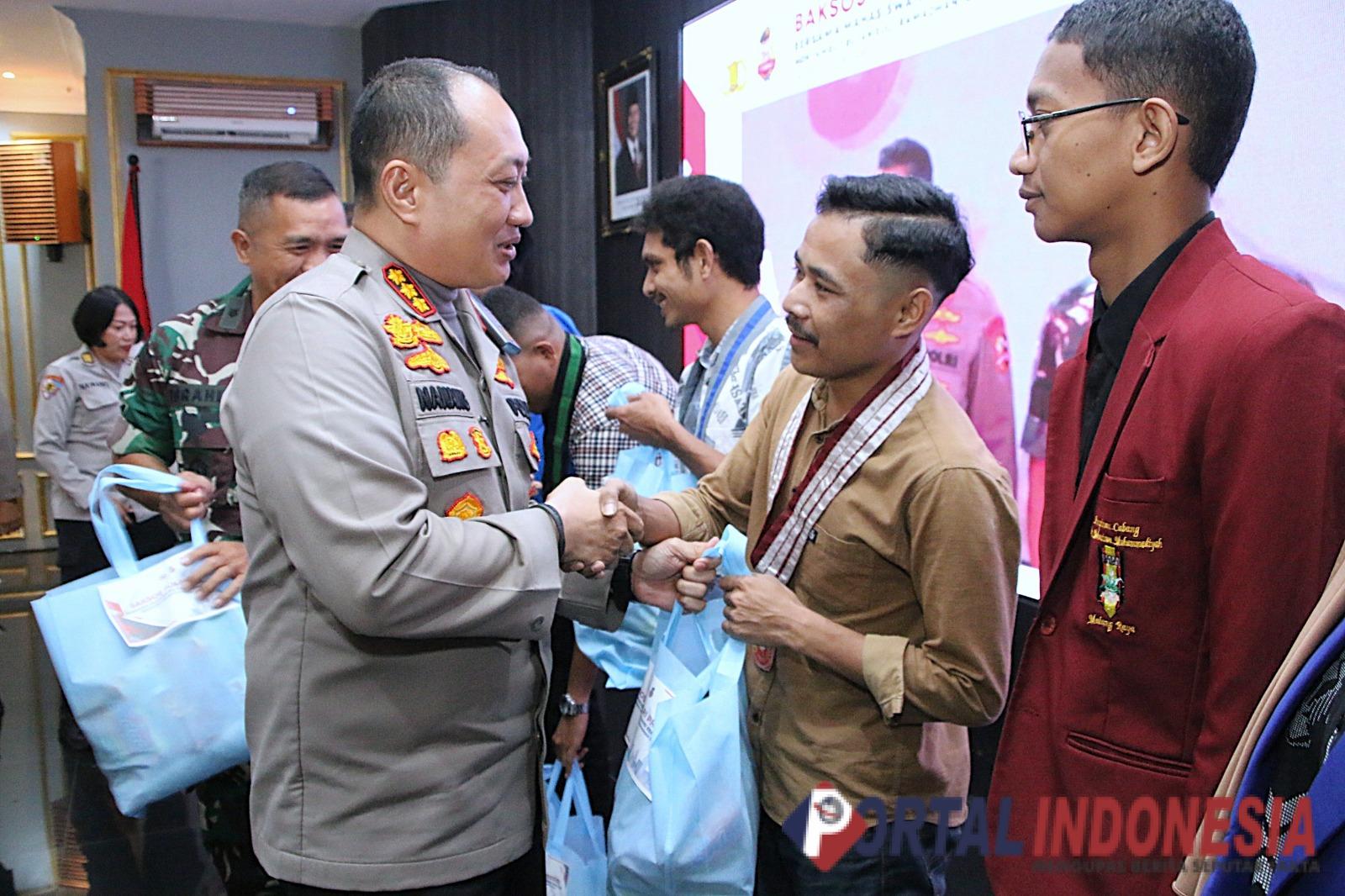 Kapolresta Malang Kota Kombes Pol Nanang Haryono secara langsung menyerahkan 300 paket sembako kepada perwakilan Aliansi Mahasiswa, BEM, serta OKP yang hadir dalam acara di Ballroom Sanika Satyawada.