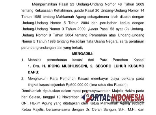 Mengadili menolak permohonan Kasasi dari para pemohon Kasasi Ipong Muchlissoni-Segoro Luhur dan menghukum para pemohon Kasasi membayar biaya perkara Rp 500 ribu rupiah.