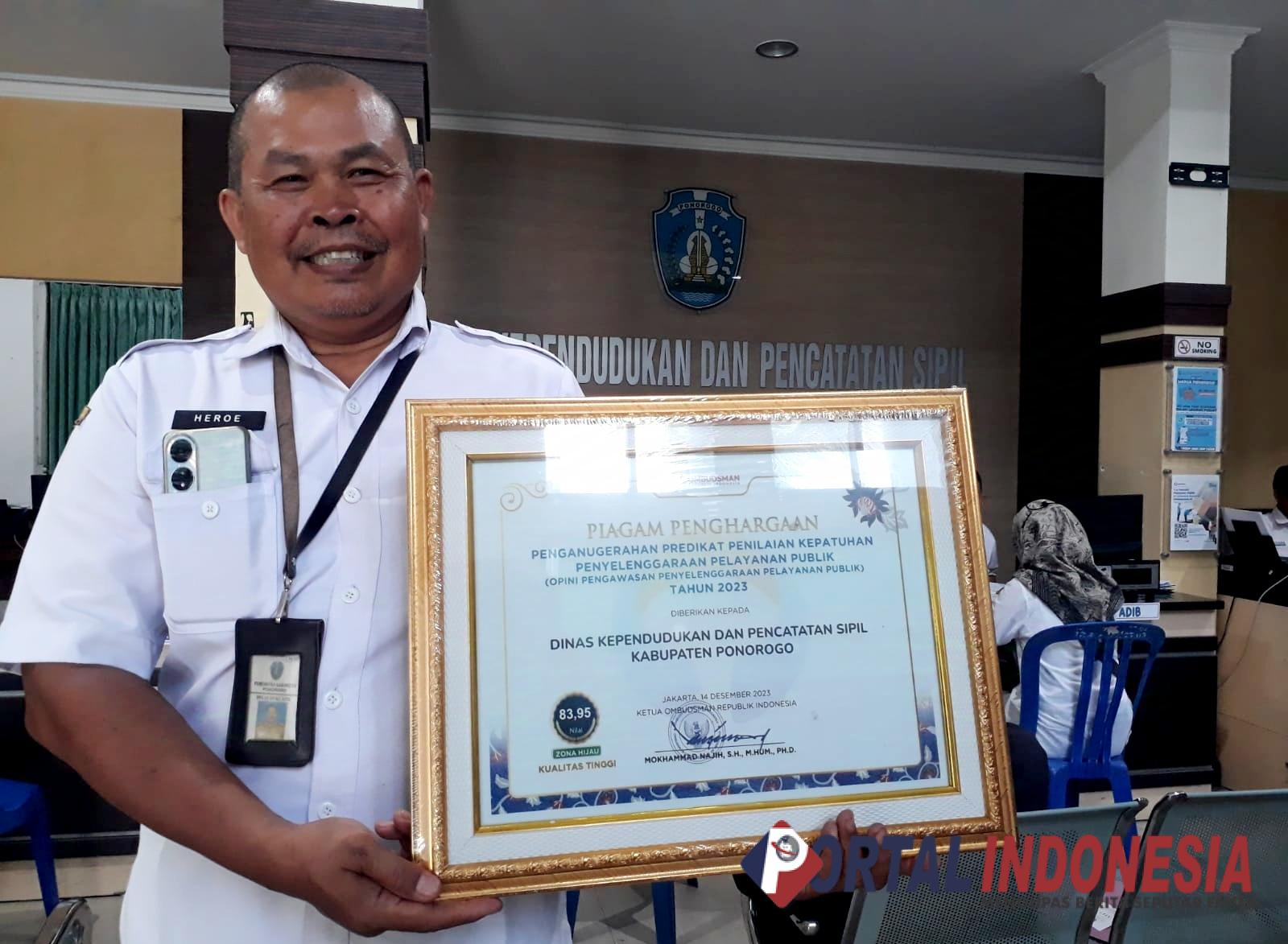 Dukcapil Ponorogo menerima penghargaan yang ditandatangani langsung Ketua Ombudsman RI, Muhammad Najih, pada 14 Desember 2023.