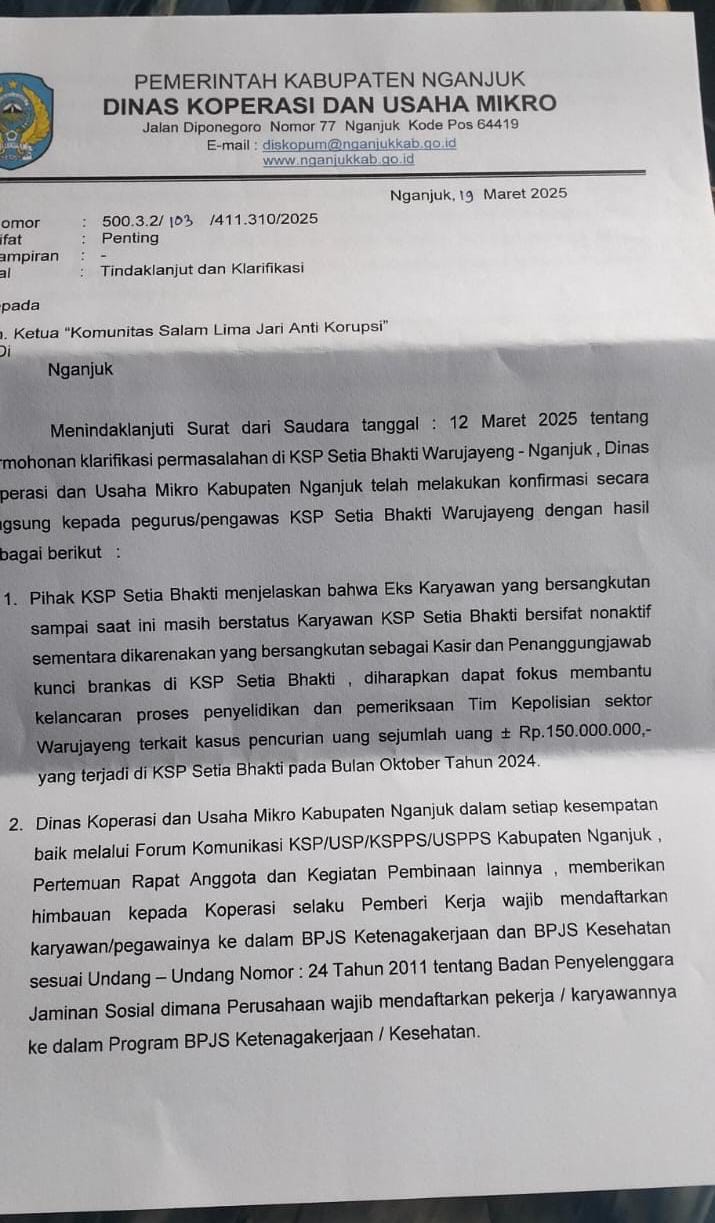Ia menyampaikan telah menerima surat tindak lanjut dan klarifikasi dari Dinas Koperasi dan usaha mikro Kabupaten Nganjuk Nomor : 500.3.2/103/411.310/2025, tertanggal 19 Maret 2025, isi surat tersebut ada 4 point penting diantaranya: