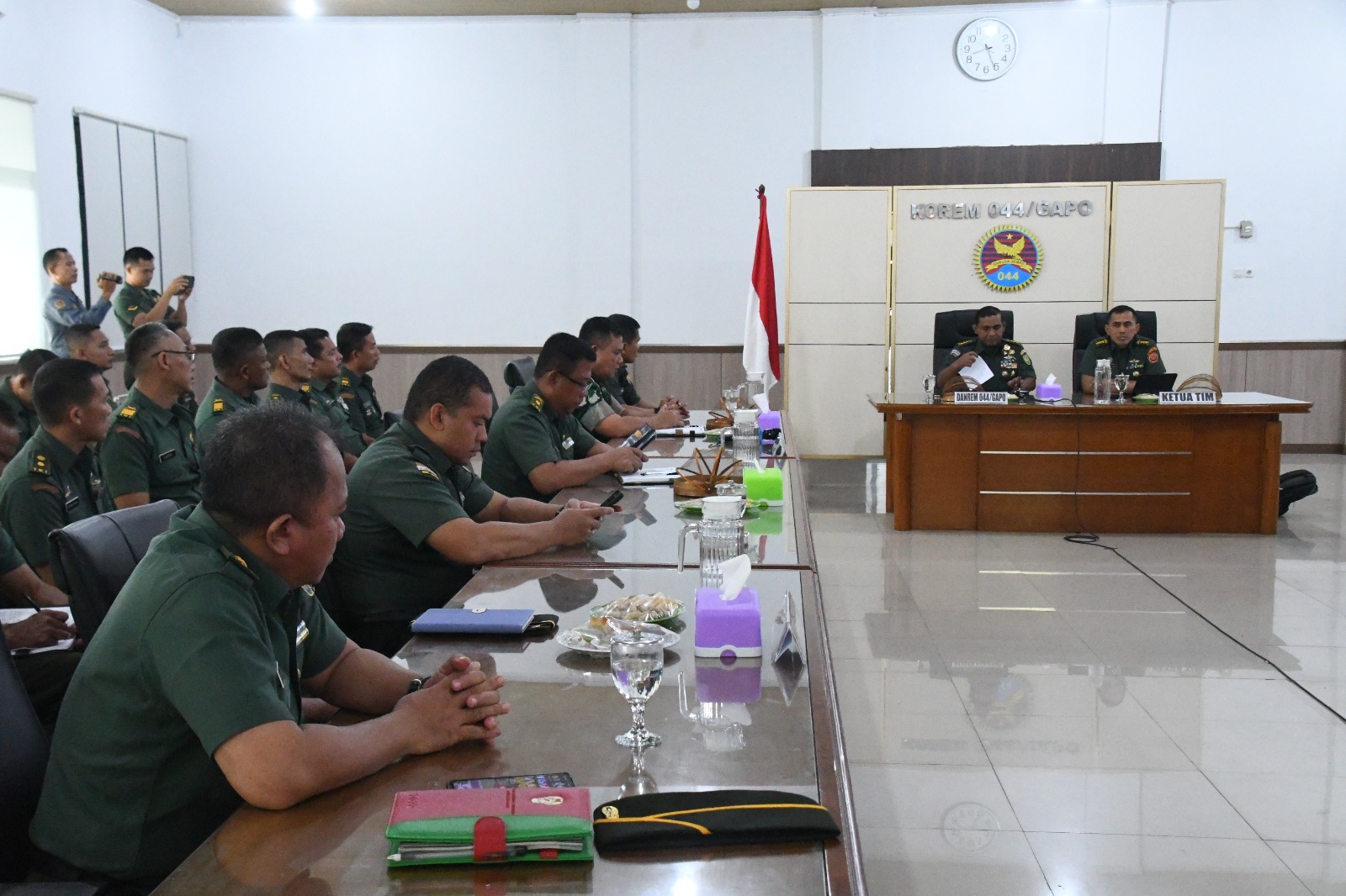 PALEMBANG — Komando Resor Militer 044/Garuda Dempo sambut kunjungan Tim Audit Kinerja Itjen TNI, bertempat di Aula Makorem 044/Gapo, Jl. Jend. Sudirman KM. 4 Kota Palembang, Selasa (30/7/2024).