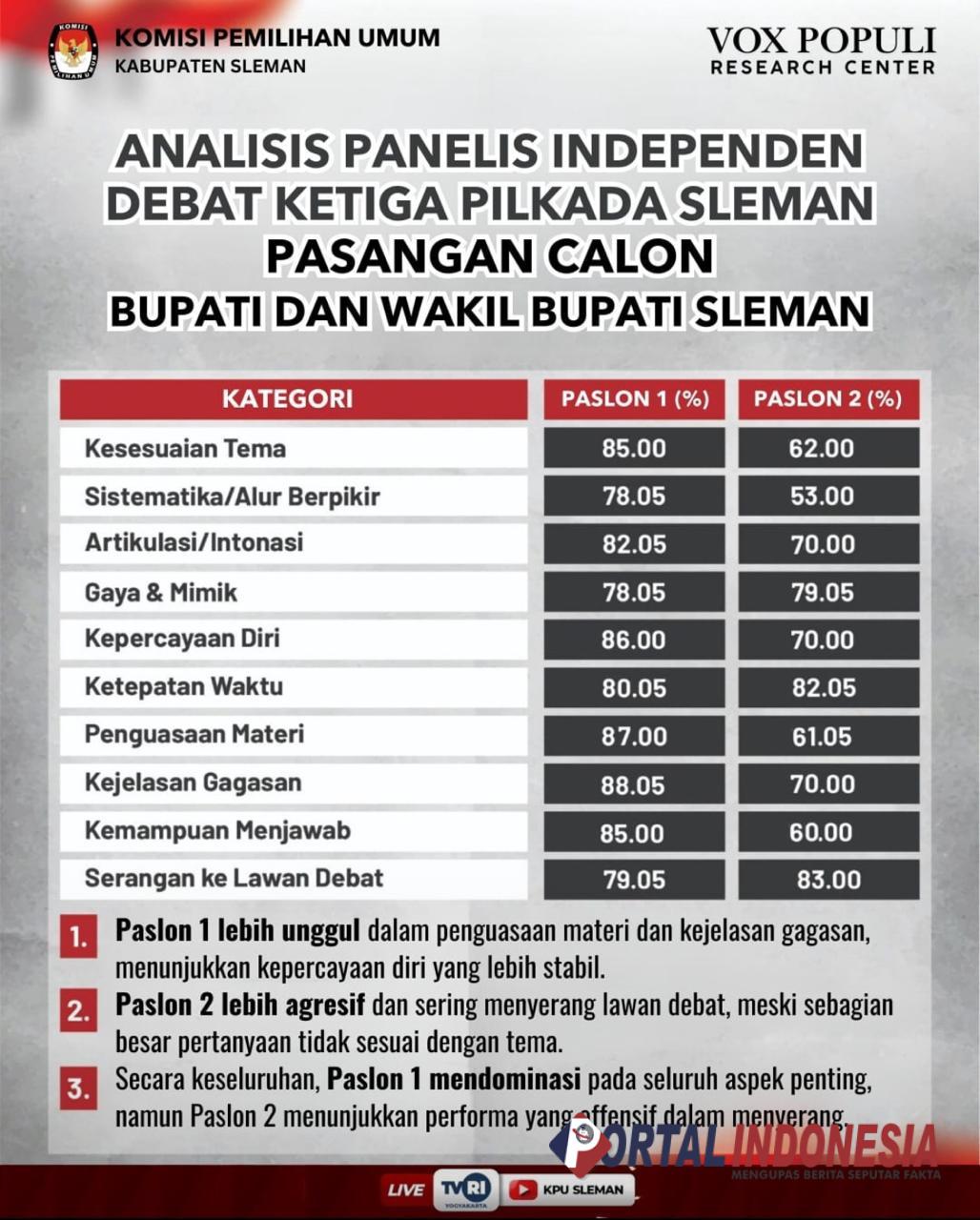 Dalam selebaran yang berjudul Analisis Panelis Independen Debat Ketiga Pilkada Sleman Pasangan Calon Bupati dan Wakil Bupati itu, terpampang logo KPU dan Vox Populi Research Center. Dalam selebaran itu, panelis memberikan penilaian masing-masing pasangan calon (Paslon).