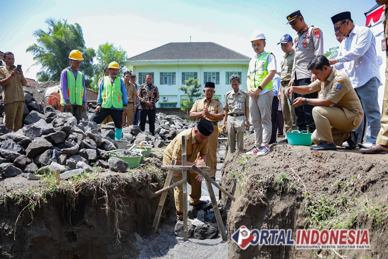 SLEMAN – Bupati Sleman Harda Kiswaya melakukan peletakan batu pertama pembangunan Gedung Serbaguna Kantor Kalurahan Purwomartani, Kapanewon Kalasan, Sleman, Senin (5/5/2025).