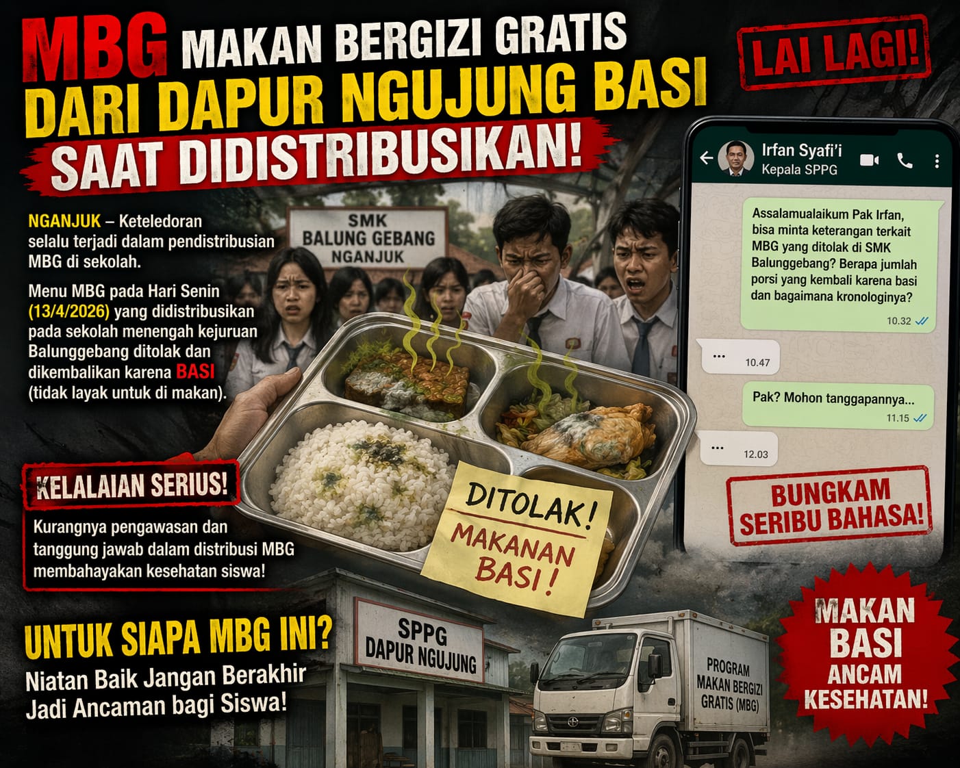 NGANJUK  – Program Makan Bergizi Gratis (MBG) kembali menuai sorotan tajam setelah ditemukan dugaan kelalaian dalam proses distribusi makanan. Insiden terbaru terjadi pada Senin (13/4/2026), saat menu MBG dari dapur penyedia di wilayah Ngujung dikirim ke salah satu SMK di Balunggebang dalam kondisi tidak layak konsumsi.