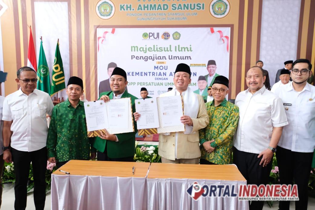 SUKABUMI – Transformasi tanah wakaf menuju pemanfaatan produktif kini memasuki babak baru. Menteri Agraria dan Tata Ruang/Kepala BPN, Nusron Wahid, menandatangani Nota Kesepahaman (MoU) dengan Dewan Pimpinan Pusat (DPP) Persatuan Ummat Islam (PUI), Rabu (16/04/2025), di Pondok Pesantren Syamsul ‘Ulum, Kota Sukabumi, Jawa Barat.