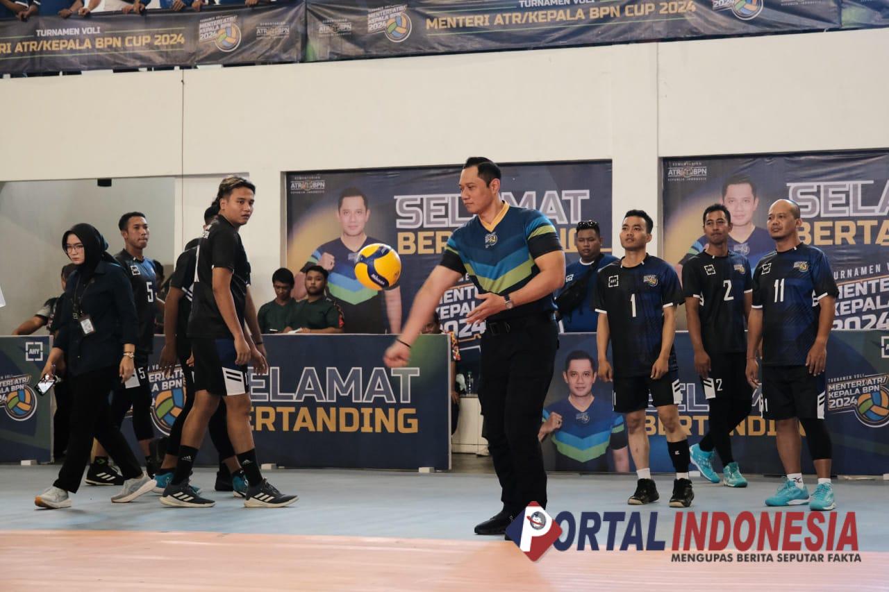 JAKARTA — Menteri Agraria dan Tata Ruang/Kepala Badan Pertanahan Nasional (ATR/BPN), Agus Harimurti Yudhoyono (AHY) membuka Turnamen Voli Menteri ATR/Kepala BPN Cup 2024 dalam rangka Hari Agraria dan Tata Ruang Nasional (HANTARU), di GOR Nanggala Kopassus, Cijantung, Jakarta, Jumat (23/08/2024). Pembukaan berlangsung secara serentak di enam regional, yakni Kota Batam, Lampung, Surabaya, Makassar, Denpasar, dan Jakarta.