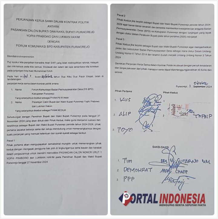 PURWOREJO – Beredarnya surat perjanjian politik antara Forum Komunikasi BPD ( Badan permusyawaratan Desa) Kabupaten Purworejo Jawa Tengah dengan salah satu pasangan calon Bupati dan wakil Bupati Purworejo membuat resah banyak anggota BPD se-Kabupaten pasalnya Mereka merasa tidak pernah diajak musyawarah selama ini.