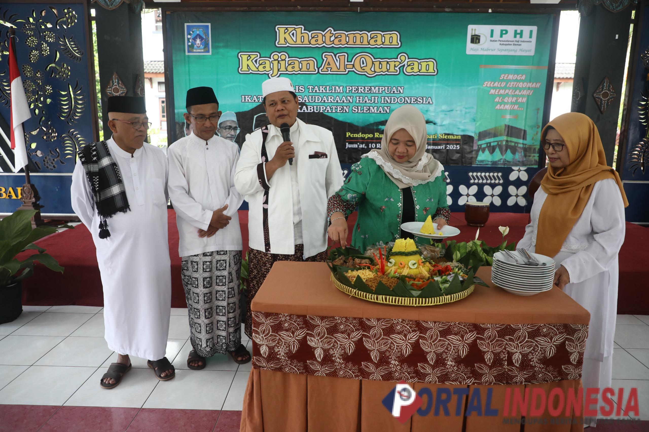 SLEMAN – Majelis Taklim Perempuan (MTP) Kabupaten Sleman menggelar acara syukuran Khataman Kajian Al Quran di Rumah Dinas Bupati Sleman, Jumat (10/1/2025). Kegiatan syukuran ditandai dengan pemotongan tumpeng oleh Bupati Sleman Kustini Sri Purnomo.