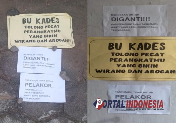 Lalu bertuliskan ‘BU KADES TOLONG PECAT PERANGKATMU YANG BIKIN WIRANG DAN AROGAN. Serta ‘TASIKMADU TIDAK BUTUH PELAKOR BIKIN MALU…. PECAT SEGERA!!! GANTI YANF BERMORAL TERIMAKASIH