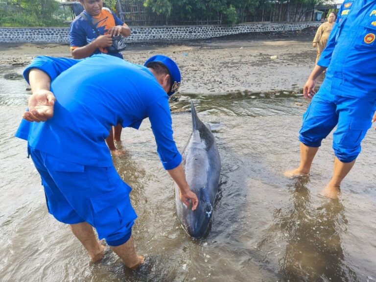 SITUBONDO – Seekor lumba-lumba ditemukan mati terdampar sekitar 0,5 mil dari bibir Pantai Wisata Kampung Kerapu, Dusun Gundil, Desa Klatakan, Kecamatan Kendit, Kabupaten Situbondo, Kamis (09/01/2025).