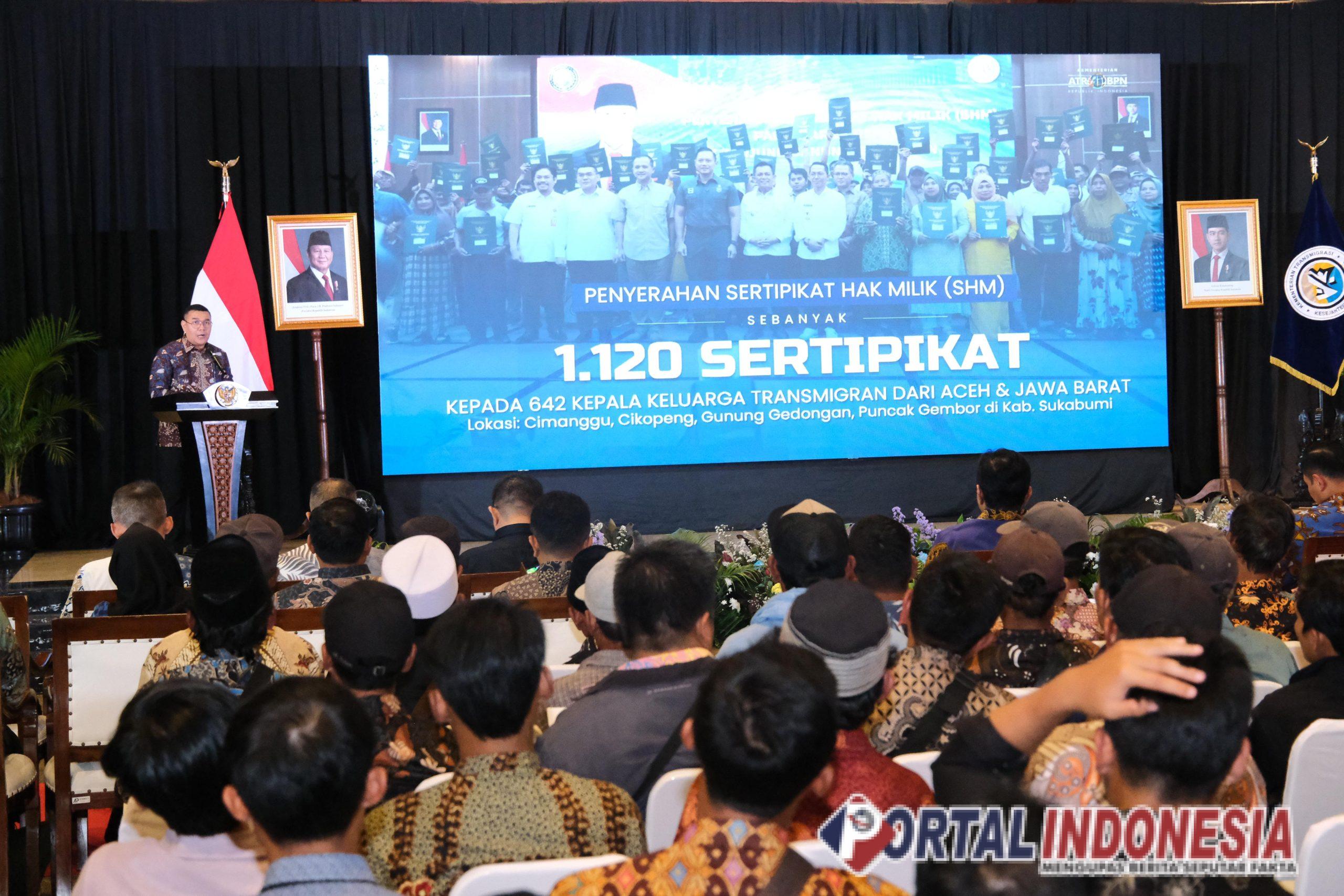 Total 1.120 sertipikat diserahkan secara langsung oleh Menteri Koordinator Bidang Infrastruktur dan Pembangunan Kewilayahan (Menko IPK), Agus Harimurti Yudhoyono (AHY), didampingi Wakil Menteri ATR/Waka BPN, Ossy Dermawan, serta Menteri Transmigrasi, Muhammad Iftitah Sulaiman, pada Selasa (18/06/2025) di Jakarta.