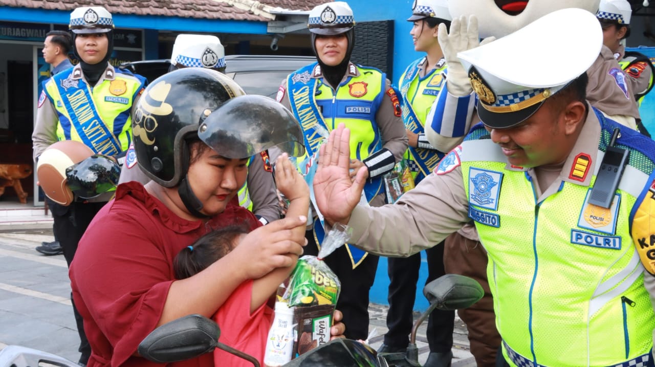 “Kita juga berikan buah tangan sebagai bentuk kepedulian kita kepada pengguna jalan, bila mereka tertib dan menggunakan kelengkapan kendaraan, saya yakin terjadinya Laka Lantas juga akan menurun bahkan bisa jadi tidak ada.” kata Kapolres.