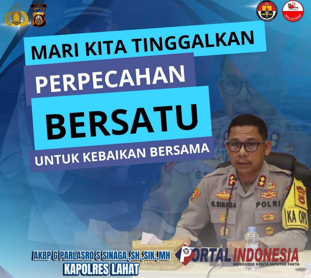 LAHAT — Kapolres Lahat AKBP God Parlasro S. Sinaga, SH, SIK, MH, bersama Waka Polres Lahat Kompol Ishandi Saputra, SH, SIK, MIK, mengajak seluruh masyarakat Kabupaten Lahat untuk kembali bersatu pasca pelaksanaan Pemilihan Kepala Daerah (Pilkada) Serentak 2024.