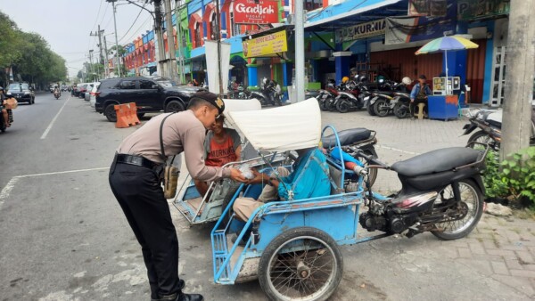 SIDOARJO — Anggota Sat Samapta Polresta Sidoarjo di saat melaksanakan patroli kamtibmas di beberapa wilayah Sidoarjo Kota, Jumat (14/6/2024) pagi, menyempatkan diri untuk peduli sesama. Mereka menebar kepedulian ke warga yang membutuhkan bantuan melalui program Samapta Delta Peduli.