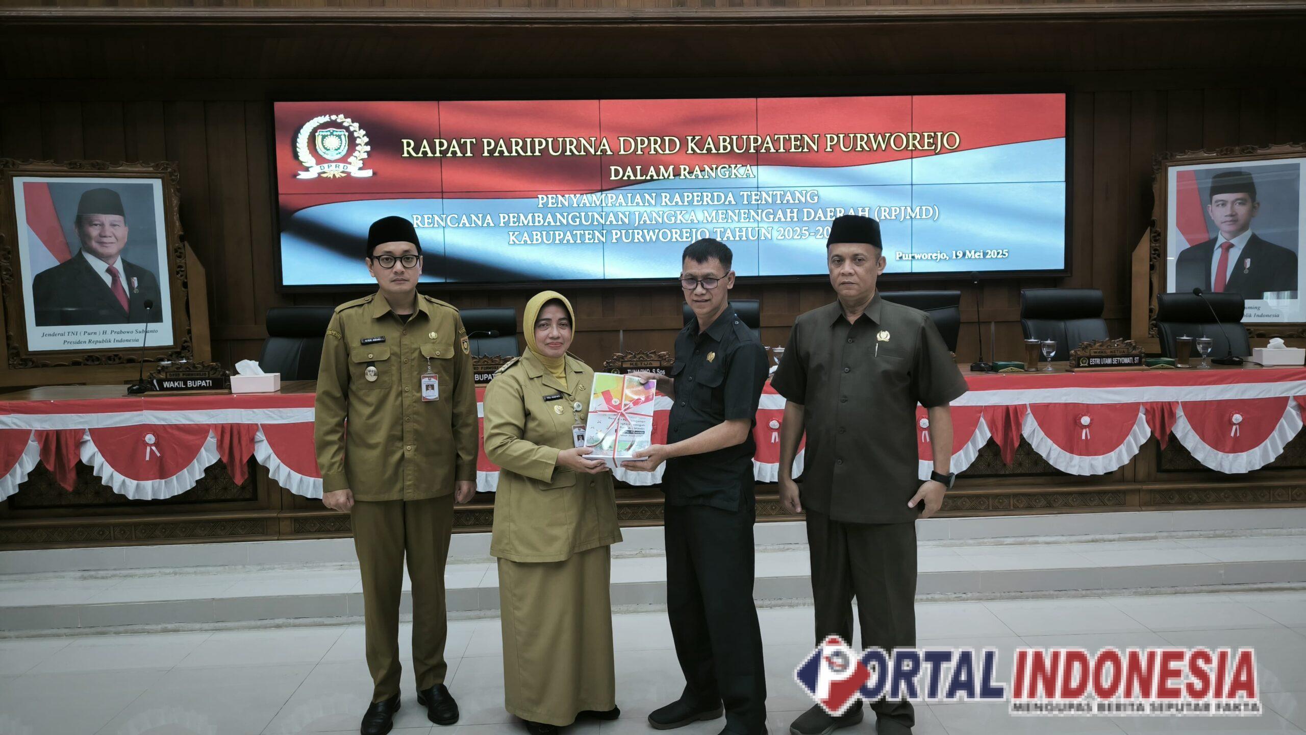 PURWOREJO – Dewan Perwakilan Rakyat Daerah (DPRD) Kabupaten Purworejo menerima dokumen materi rancangan peraturan daerah tentang Rencana Pembangunan Jangka Menengah Daerah (RPJMD) Kabuapten Purworejo 2025-2029 yang diserahkan oleh Bupati Purworejo Yuli Hastuti dalam rapat paripurna yang diadakan di gedung DPRD setempat, Senin (19/5/2025).