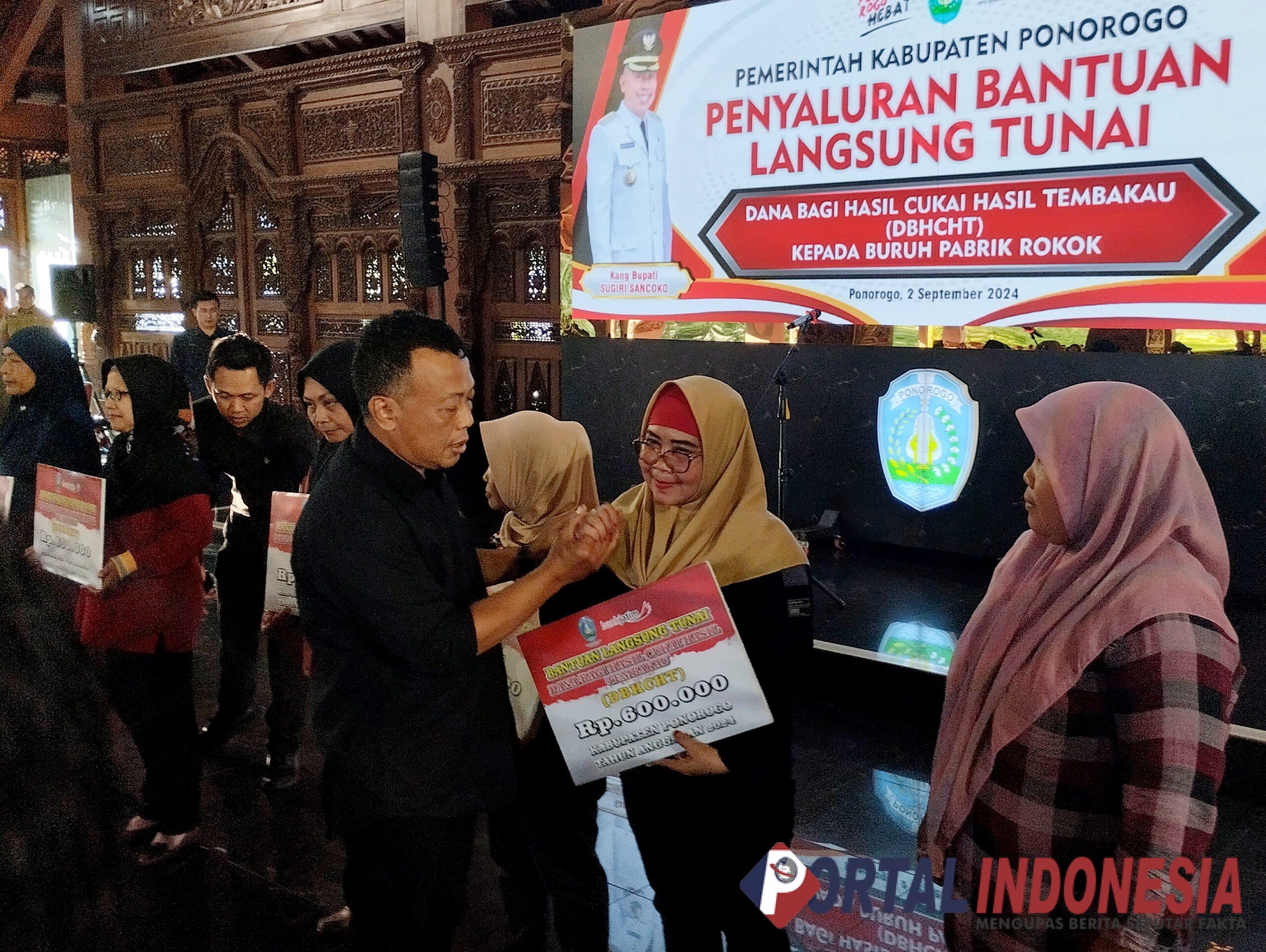 PONOROGO – Pemerintah Kabupaten (Pemkab) Ponorogo menyerahkan bantuan langsung tunai (BLT) DBHCHT bagi buruh pabrik rokok dan petani tembakau.