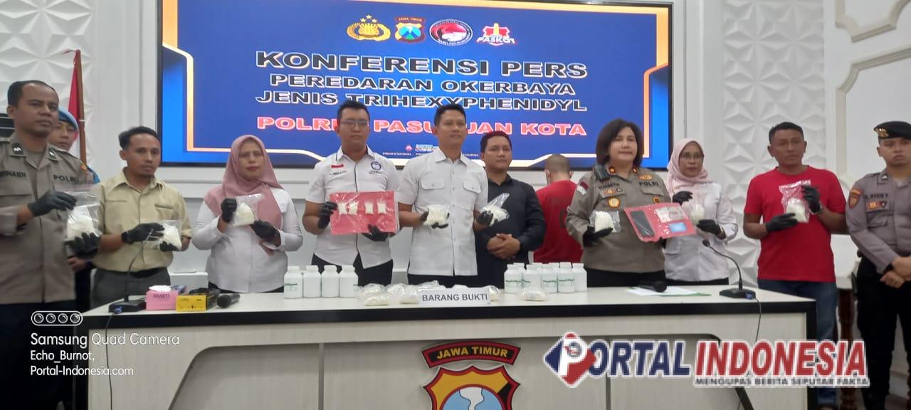 PASURUAN – Satresnarkoba Polres Pasuruan Kota, Polda Jawa Timur berhasil mengungkap sekaligus mengamankan seorang pelaku yang diduga tanpa ijin mengedarkan obat keras berbahaya (Okerbaya) dengan jenis Trihexiphenidyl alias pil koplo, dalam press release yang digelar di ruang Rupatama Sanika Satyawada, pada Rabu (28/5) siang.
