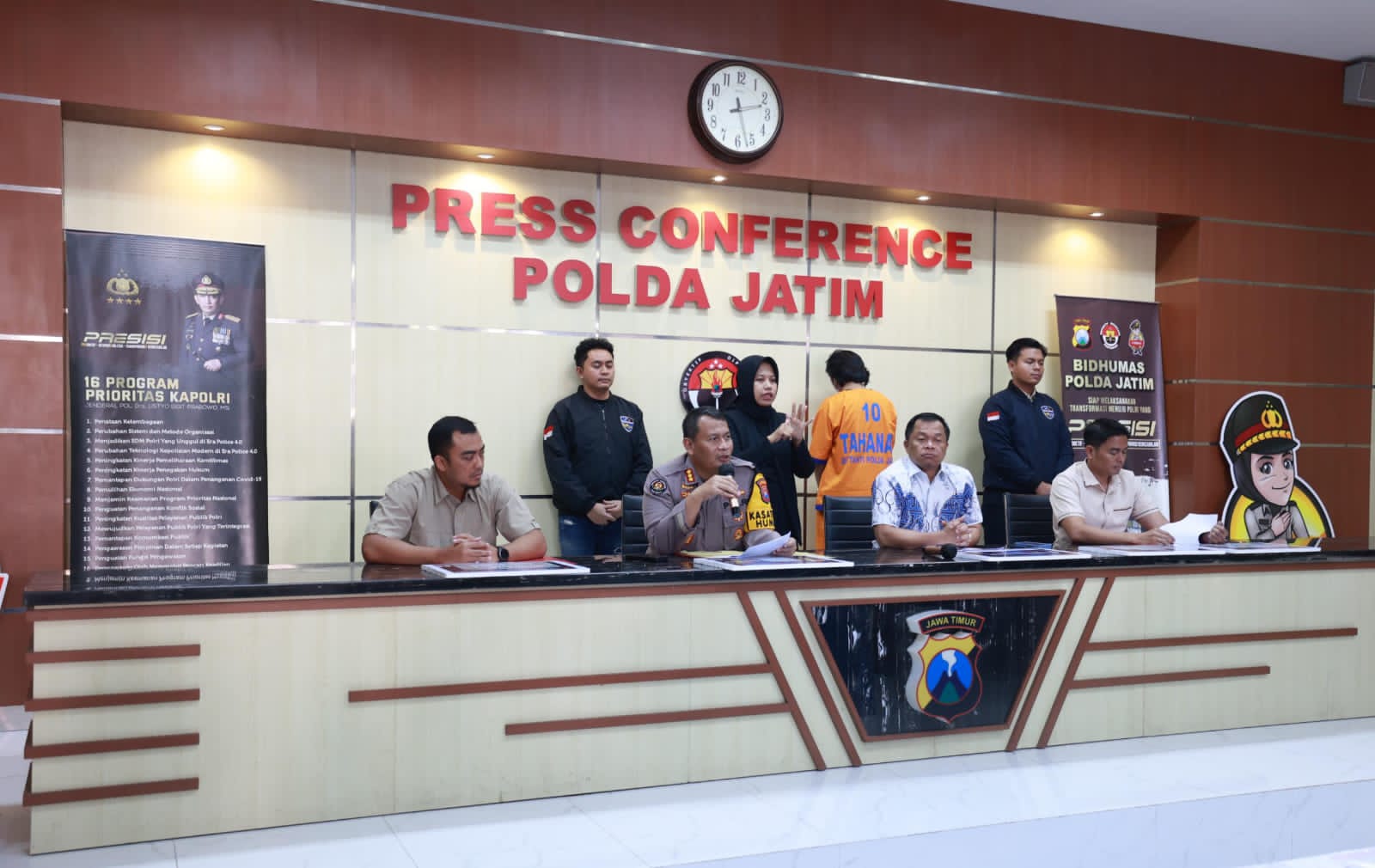 Polda Jatim saat Konferensi Pers kasus pembuat konten asusila anak yang juga hadirkan tersangka.