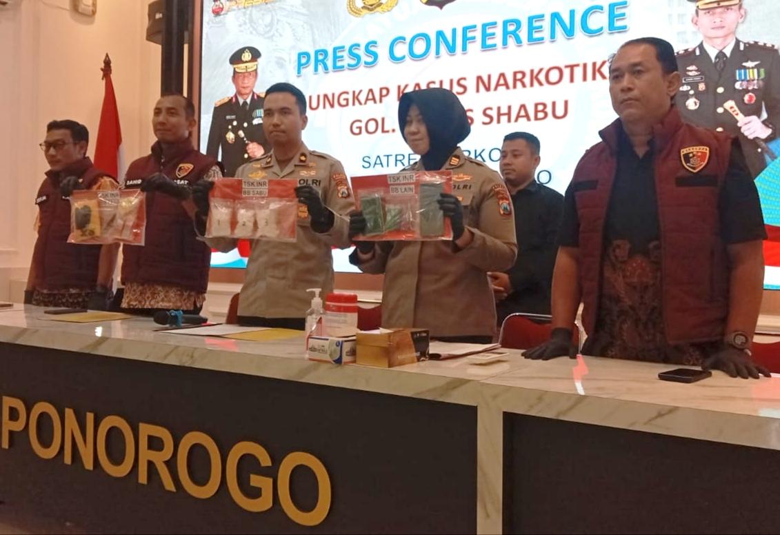 Aparat kepolisian Polres Ponorogo saat menunjukkan sejumlah barang bukti sabu