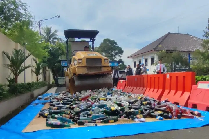 Pemusnahan miras di depan Mapolres setempat dengan cara dilindas dengan slender atau stoomwals. Air beralkohol masuk ke dalam selokan, sementara pecahan botol dikumpulkan untuk didaur ulang. (PJ)